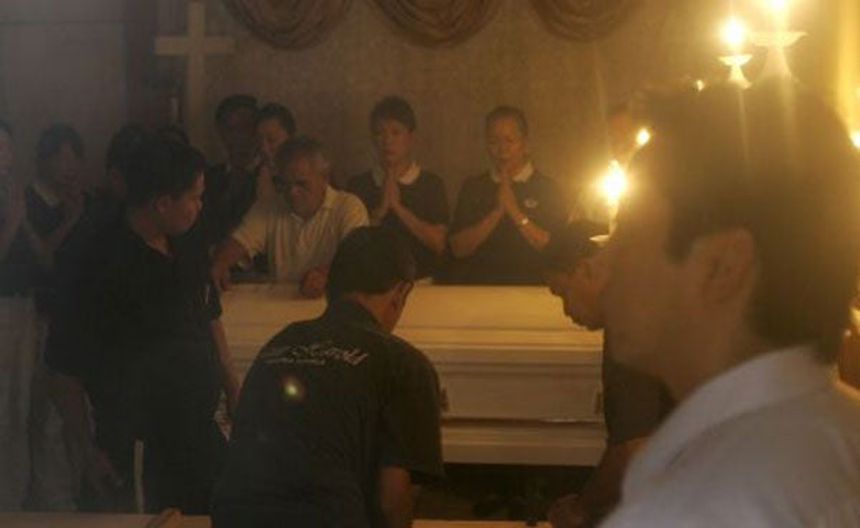 A las dos horas de falso funeral, al que asistían unas 300 personas y que era vigilado por 80 policías debido a la sensibilidad del suceso, Han salió repentinamente del ataúd, tomó una botella de agua y, tras decir "no puedo más", se la bebió de un trago.