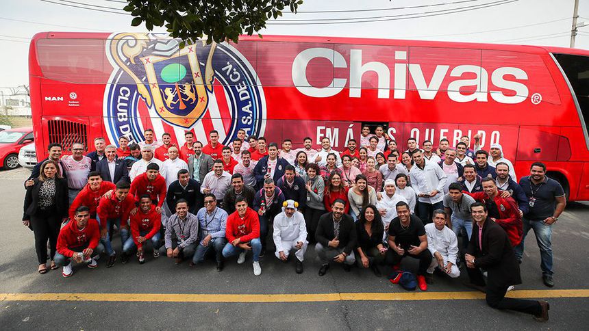 Al terminar el recorrido los jugadores de la escuadra tapatía y los empleados de Grupo Omnilife se tomaron la foto del recuerdo con el camión del equipo de fondo.
