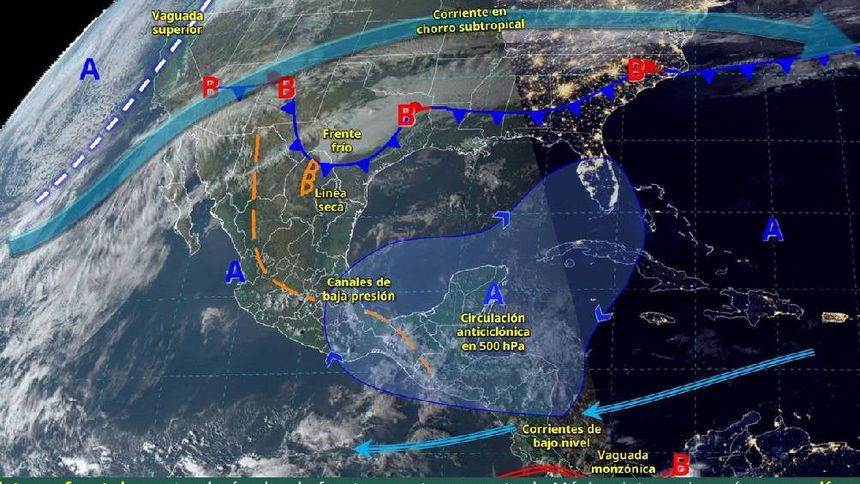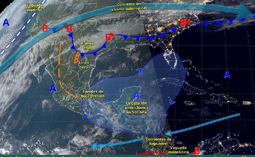 Se anticipa que los canales de baja presión en varias regiones de México, junto con la humedad del Océano Pacífico y el Mar Caribe, provocarán lluvias y tormentas eléctricas, especialmente en el Valle de México y la Península de Yucatán. Se esperan lluvias fuertes en Chiapas (25 a 50 mm) y chubascos en Coahuila, Estado de México, Guerrero, Oaxaca, Campeche y Quintana Roo (5 a 25 mm). También habrá lluvias aisladas en Chihuahua, Nuevo León, Tamaulipas, Michoacán, Ciudad de México, Morelos, Puebla y Veracruz (0.1 a 5 mm). Las temperaturas máximas oscilarán entre 40 y 45°C en Guerrero y Oaxaca, y 10 entidades tendrán temperaturas de 35 a 40°C.