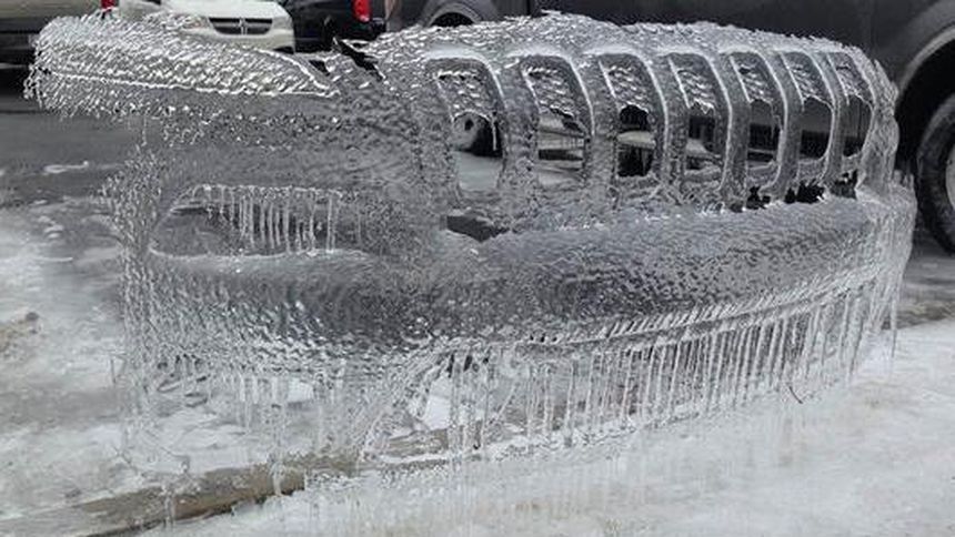 Una camioneta Jeep dejó una escultura de hielo de su defensa en un estacionamiento de un hospital en Carolina del Norte, Estados Unidos.