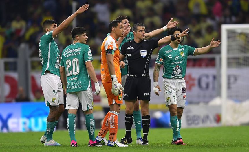 Después de la primera anotación del América, con la que empató el encuentro de forma momentánea, los jugadores del León se acercaron al árbitro para reclamar una posible mano de Israel Reyes, a lo que se logró percibir que el árbitro respondió con la agresión, mientras mostraba la cartulina amarilla.