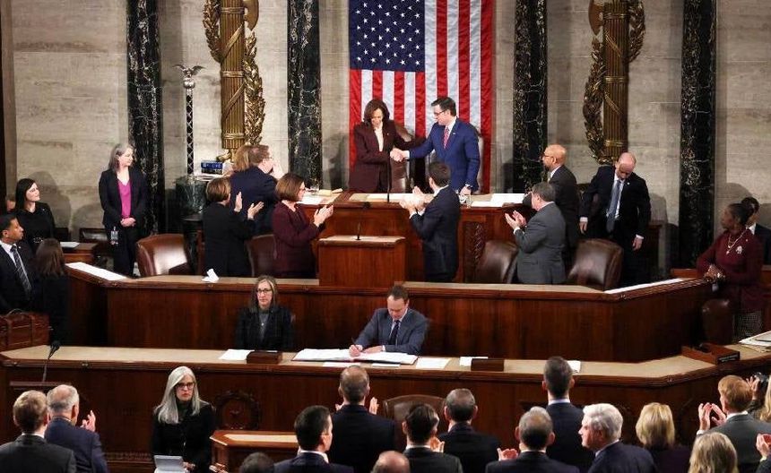 Un total de 147 legisladores del Partido Republicano intentaron impugnar la certificación de Biden; sin embargo, en la sesión de hoy no se presentaron objeciones por parte de ningún legislador. Kamala Harris presidió la sesión con seriedad, aunque también tuvo momentos de cordialidad con el presidente de la Cámara, Mike Johnson.