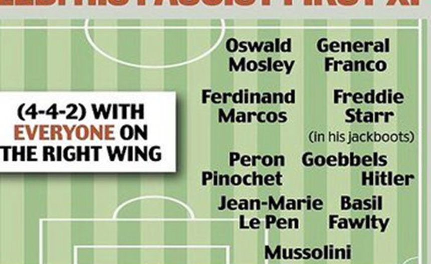 El once completo, distribuido en un 4-4-2, es éste: Mussolini; Hitler, Basil Fawlty (personaje de la serie televisiva ';Fawlty Towers), Le Pen, Pinochet; Freddie Star (violento comediante y cantante inglés come hámsters), Goebbels, Perón, Ferdinand Marcos; Franco y Oswald Mosley (fundador de la Unión Británica de Fascistas).