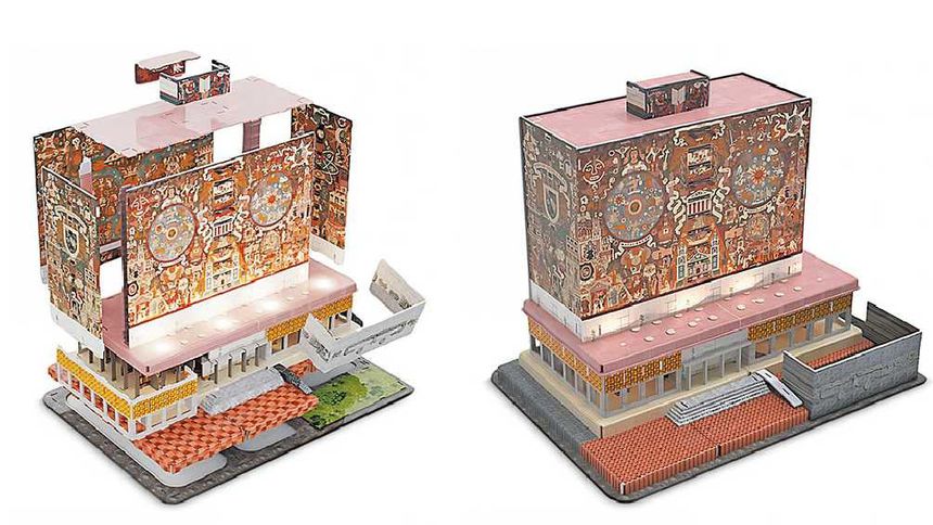 El rompecabezas miniatura de la Biblioteca Central de la UNAM es 3D, sus medidas son 37.5 cm de frente, 31 cm de alto y 33 cm de fondo.