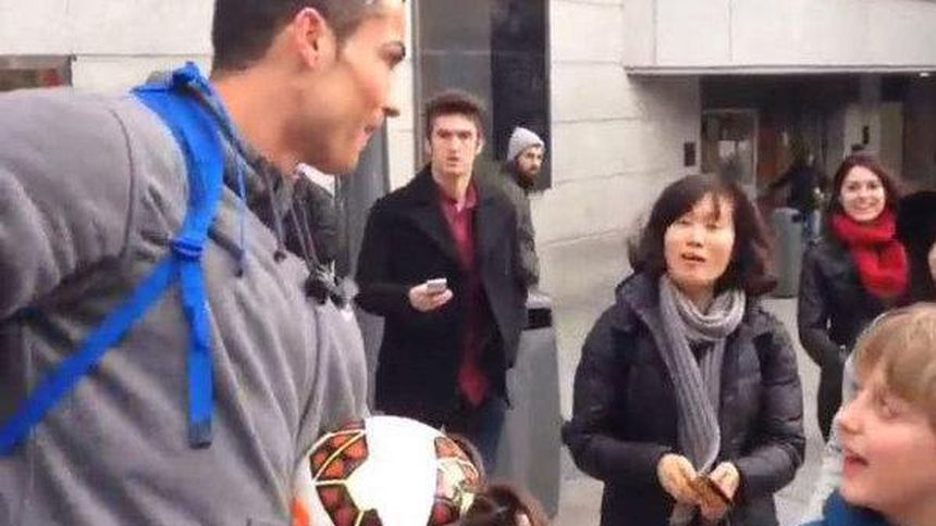 Cristiano Ronaldo sorprendió a un niño en la Plaza del Callao, en el centro de Madrid, apareciendo disfrazado para regalarle un balón autografiado.