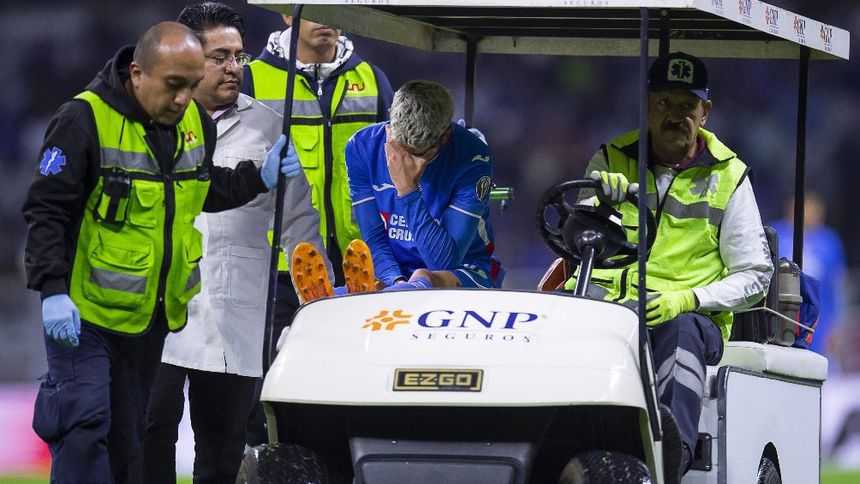 El lateral izquierdo del conjunto celeste se lesionó la rodilla al intentar quitarle el balón a Rafael Carioca. Se quedó tendido sobre la cancha del Estadio Azteca, entraron los médicos a revisarlo y lo tuvieron que sacar en el carrito de las desgracias.