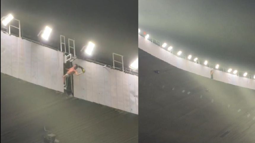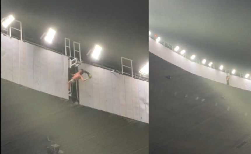 La imprudencia del aficionado puso en peligro su vida a varios metros por varios minutos prácticamente colgado debajo de las lámparas que iluminan el estadio