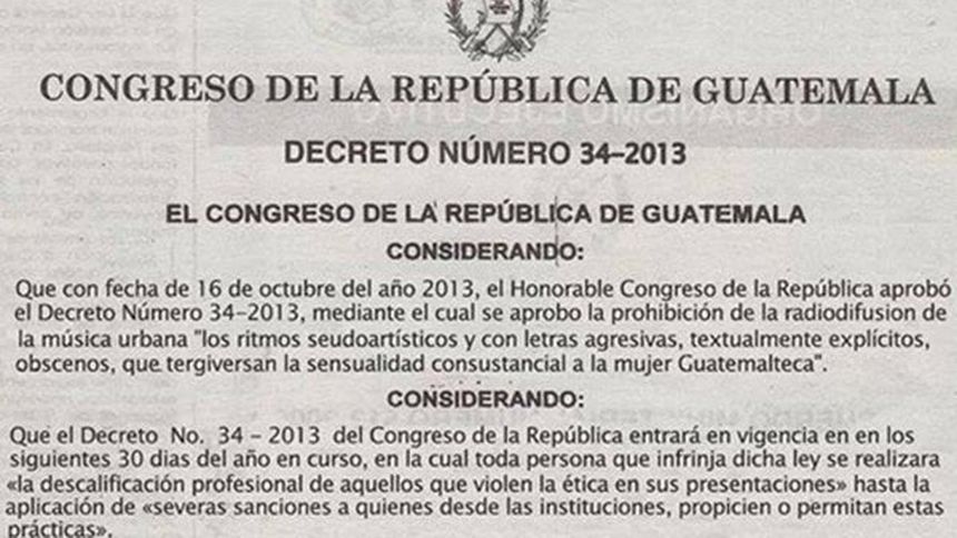 Un decreto aprobado por el Congreso de la República de Guatemala, prohíbe la radiodifiusión de música urbana con "ritmos seudoartísticos y letras agresivas, textualmente explícitos, obscenos, que tergiversan la sensualidad consustancial a la mujer guatemalteca", o sea el reggaeton.