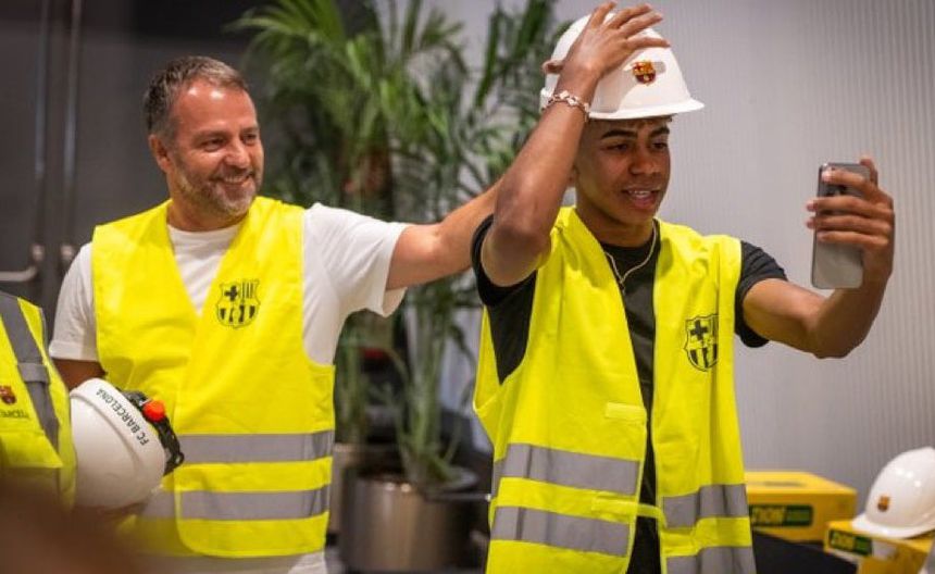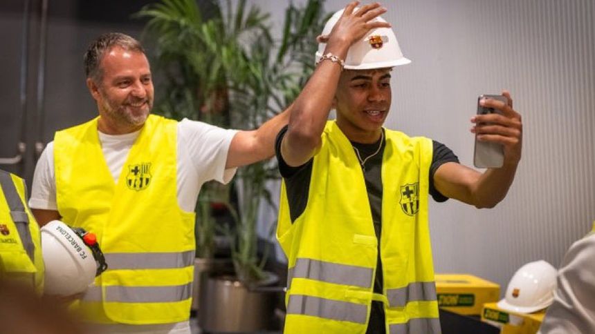 Lamine Yamal encabezó la visita del equipo del Barcelona a las obras del Camp Nou. Hace unos días el joven futbolista estaba alzando el trofeo de la Eurocopa en Alemania, y ahora se mostraba firme vistiendo con casco y con plano en mano para ver la remodelación del estadio.