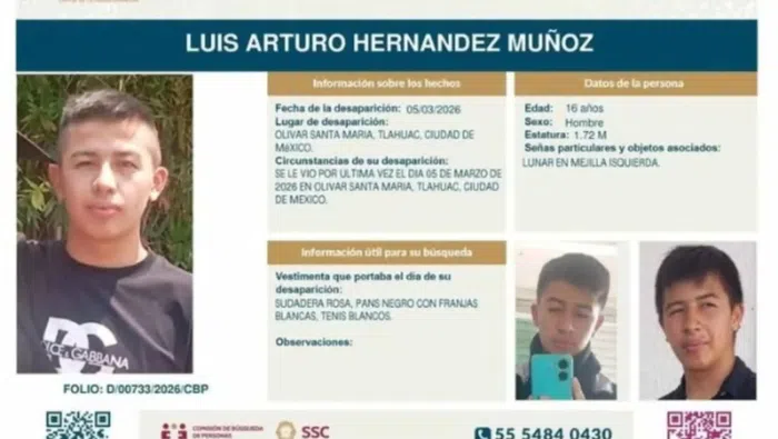 Ante esta situación, familiares y amigos continúan difundiendo la información del caso y piden a la ciudadanía compartir la ficha de búsqueda y reportar cualquier dato que pueda ayudar a localizar a Luis Arturo Hernández, de 16 años.