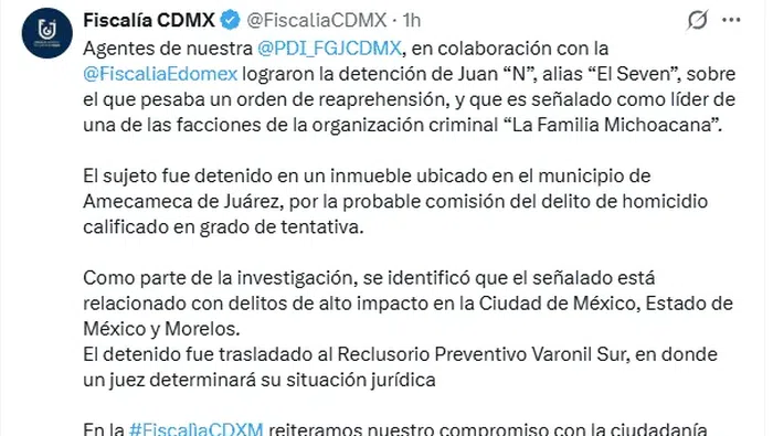 La Fiscalía General de Justicia de la Ciudad de México (FGJCDMX), en coordinación con la Fiscalía del Estado de México, informó sobre la detención de Juan “N”, conocido como El Seven o El Siete, identificado como uno de los principales líderes de la organización criminal La Familia Michoacana.