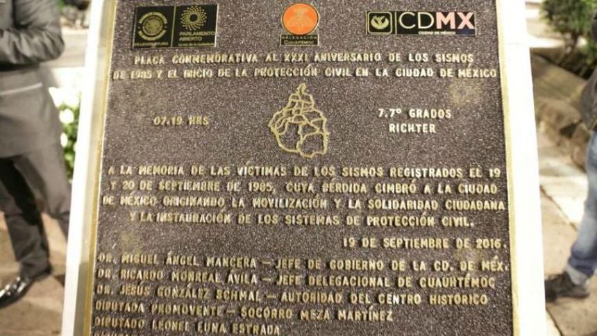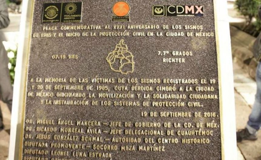 Como parte de los eventos para conmemorar el 31 aniversario del sismo que sacudió a la Ciudad de México en 1985, fue develada una placa en la Plaza de la Solidaridad, la cual tenía una error sobre la magnitud del temblor.