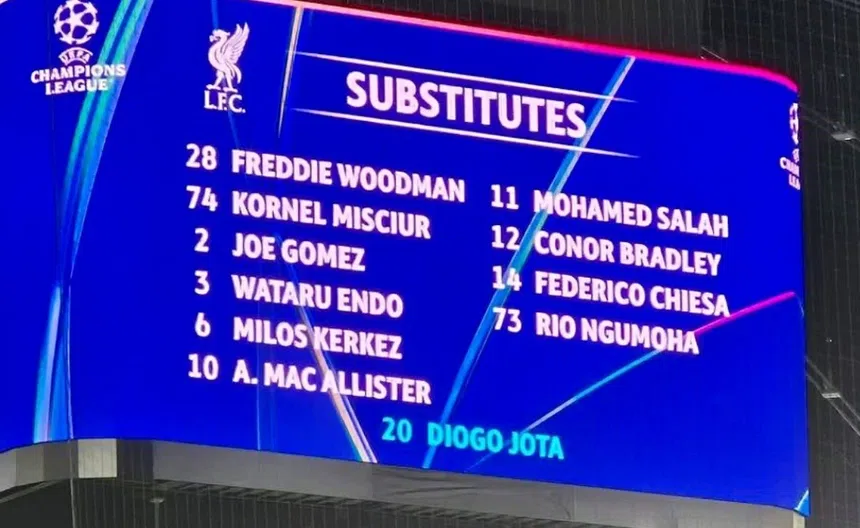 En la pantalla colgante del Deutsche Financial Institution Park, se mostró la alineación del Liverpool, la cual tenía muchas rotaciones luego de arrastrar una racha de cuatro partidos perdidos, por lo que Arne Slot decidió ajustar profundamente.