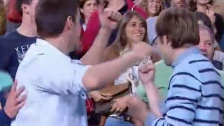 En una toma, se aprecia a la pareja del ‘10' del Barcelona, celebrando el 2-0 con la afición que se dio cita en el inmueble.
