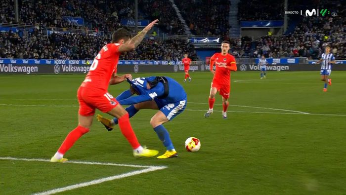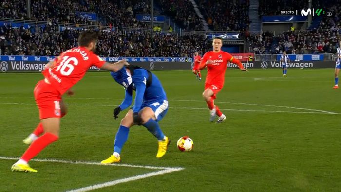 La jugada ocurrió en la segunda mitad, cuando el marcador reflejaba un 2-1 para el Alavés. En una acción dentro del área, Toni Martínez, autor del segundo tanto de Alavés, disputaba un balón cuando Caleta-Car lo sujetó de la camiseta y se la levantó por encima de la cabeza, impidiéndole la visión al delantero. En primera instancia, el árbitro central no señaló la infracción, pese a la evidente sujeción.