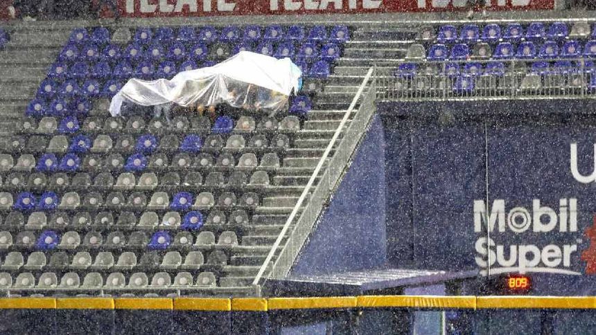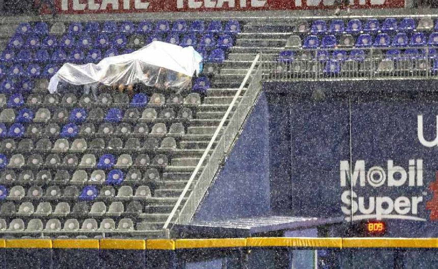 Una hora más tarde la lluvia se dio cita en el Estadio Mobil Super, la casa de los Sultanes, por lo que los trabajadores del inmueble tuvieron que poner una vez más la lona sobre el diamante.