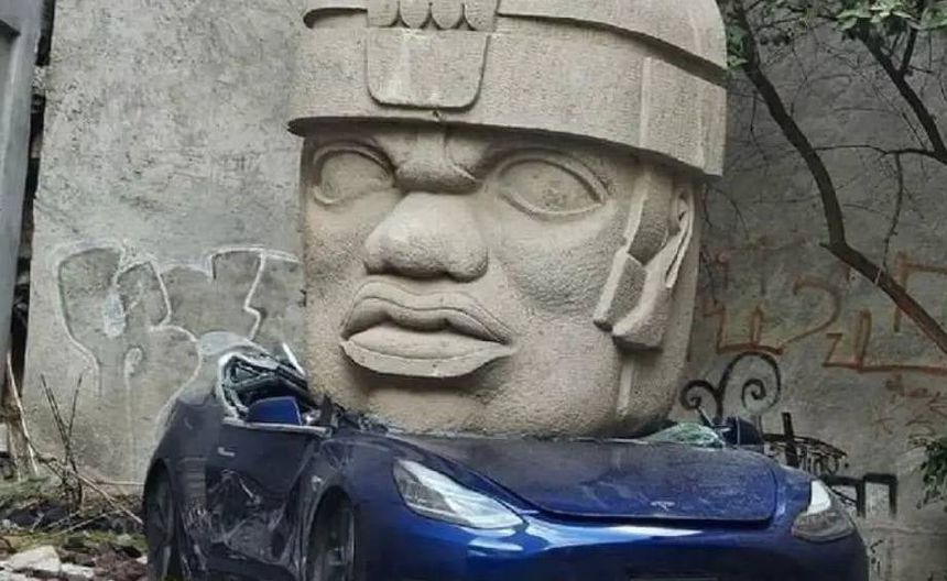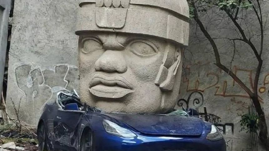 En CDMX aparece Tesla aplastado por una cabeza Olmeca