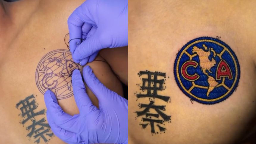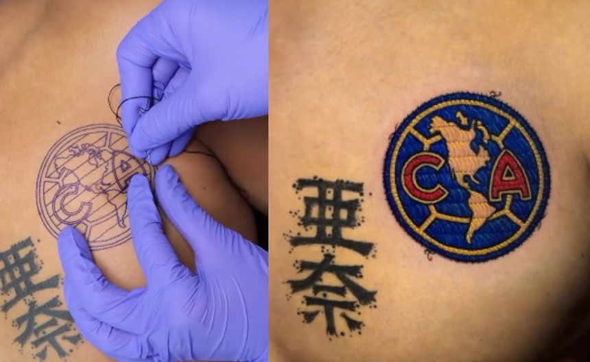 Este tatuaje se volvió viral en redes sociales pues parece que este aficionado se ‘bordó’ el escudo en el pecho, pero se trata de una técnica de tatuaje llamada ‘Patch Tattoo’ que justamente busca emular que el tatuaje es una imagen bordada en la piel.