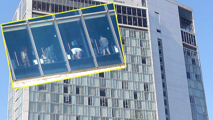 Los enormes ventanales exponen cada movimiento de las personas cuando entran al baño, aunque ellos no lo saben, pues imaginan que son cristales polarizados.