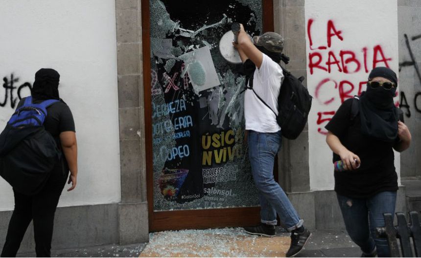 En el trayecto que fue del Ángel de la Independencia hasta la plancha del Zócalo capitalino, varios sujetos encapuchados rompieron vidrios de puertas y ventanas de varios establecimientos.