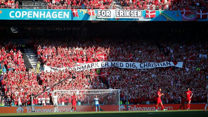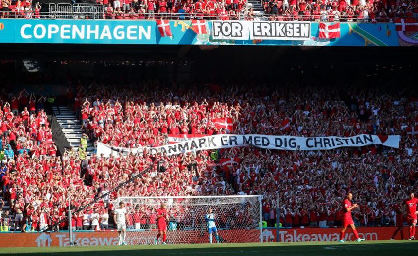 Al llegar a ese minuto, que coincide con el número de Eriksen, los fanáticos empezaron a aplaudir. Como estaba acordado, Meunier echó la pelota fuera y los jugadores de ambos equipos se unieron en un aplauso que duró un minuto, mientras en las gradas se desplegaba una pancarta con el lema "Toda Dinamarca está contigo, Christian".