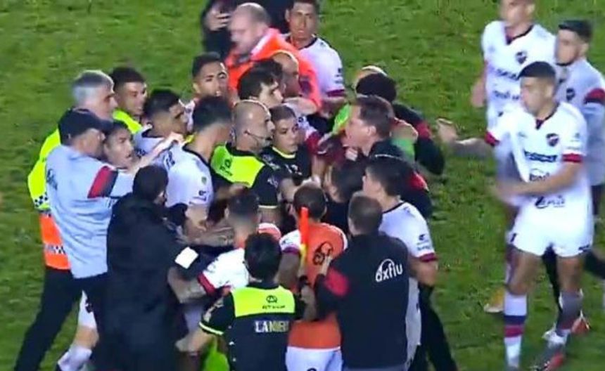 Después, el espectáculo continuo, los futbolistas rodearon al juez de línea, la policía intervino y empezaron los manotazos, donde varios jugadores terminaron el césped.