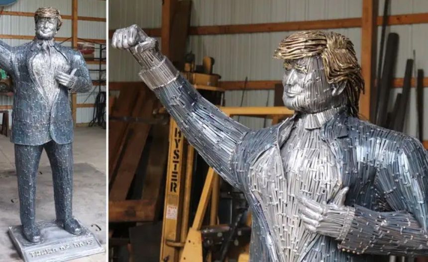 La estatua está compuesta por alrededor de 4.000 clavos de metal retorcidos y doblados, retrata a Trump con un traje azul marino claro y el brazo levantado.