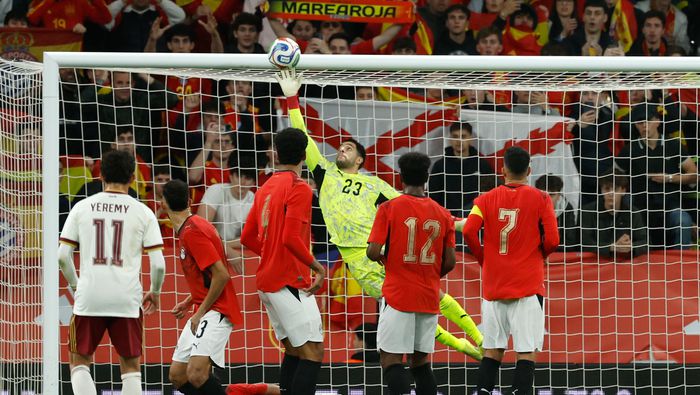 David Raya, el arquero de España, salió a reventar un balón con los puños, pero no midió la distancia y le pegó al defensa egipcio Yasser Ibrahim.