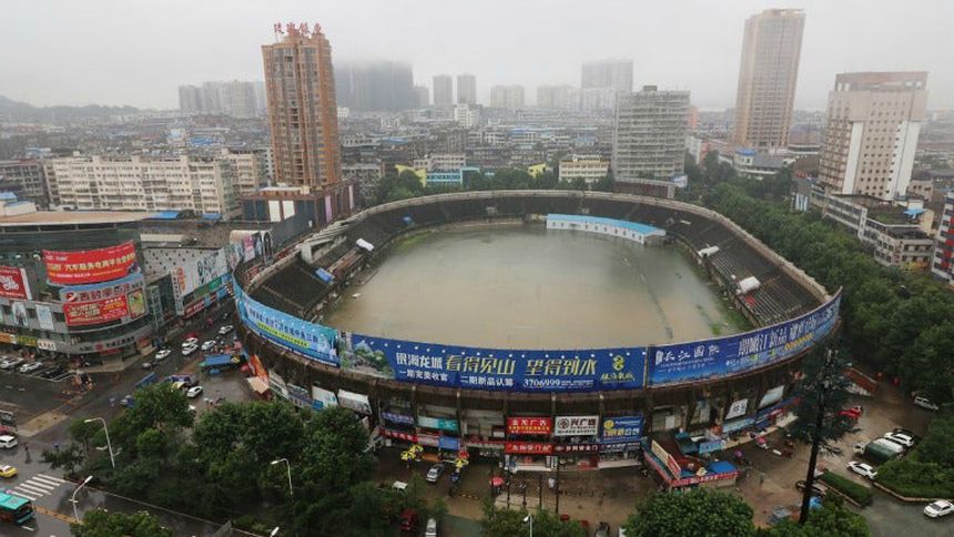 Estadio chino se convierte en piscina por fuertes lluvias