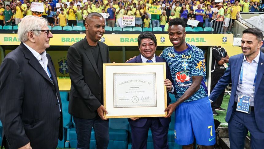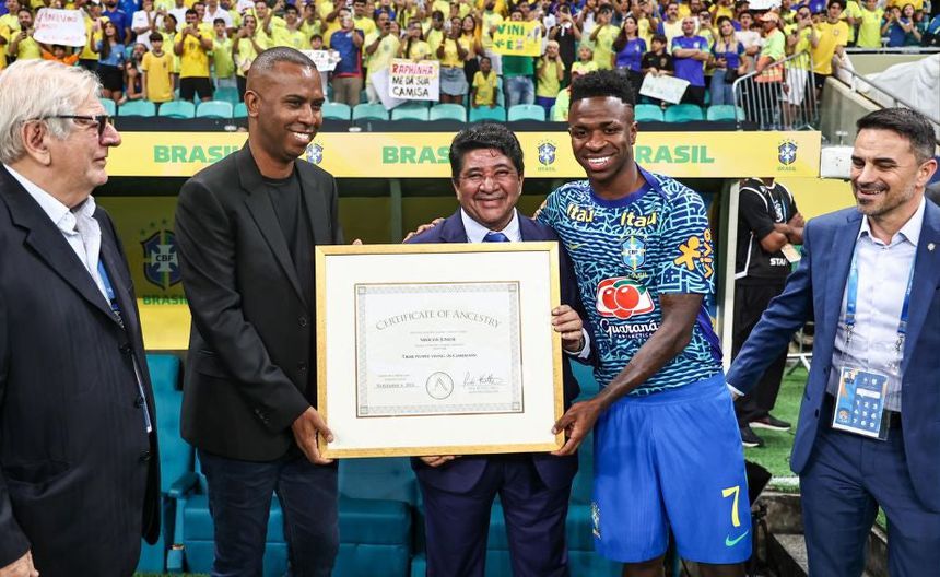 El atacante del Real Madrid y la selección brasileña, Vinicius Jr., vivió un momento especial antes del enfrentamiento entre Brasil y Uruguay por las eliminatorias mundialistas. En un emotivo acto, el futbolista de 24 años recibió una placa que confirma su ascendencia de la tribu Tikar, originaria de Camerún.