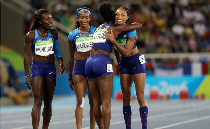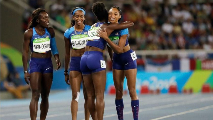 Durante la carrera, Allyson Felix falló en el traspaso de la estafeta, dejándola caer el suelo, por lo que ella y sus compatriotas fueron descalificadas.