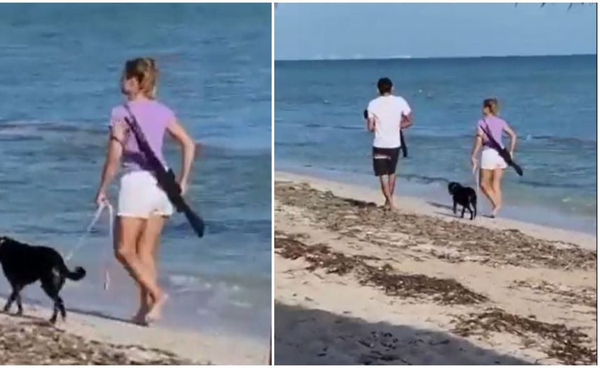 Una pareja fue observada en un video en donde aparecen caminando a la orilla de la playa y la mujer porta colgando al hombro un rifle calibre 4.5.