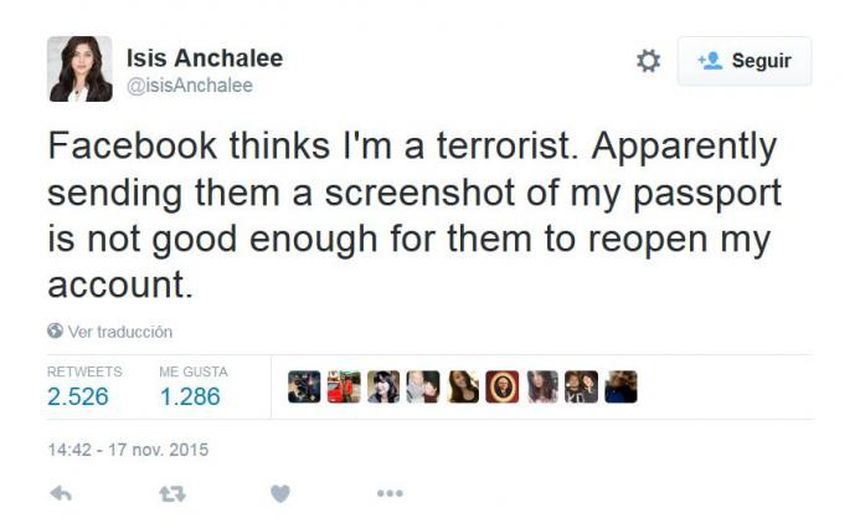 "Facebook piensa que soy una terrorista. Aparentemente enviarles una captura de pantalla de mi pasaporte no es suficiente para volver a abrir mi cuenta", publicó la indignada joven al respecto.