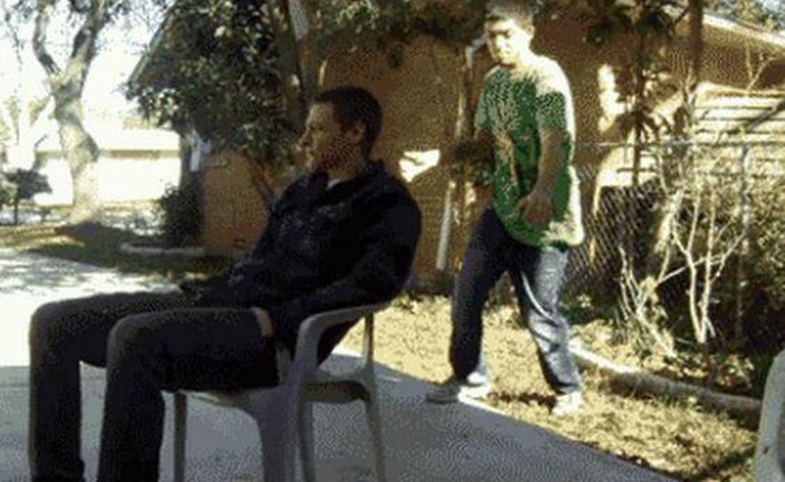 En un intento por patearle la silla, este joven terminó en el suelo | ESPECIAL