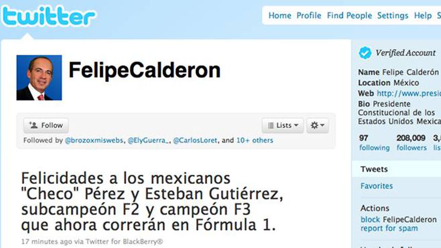 El Presidente de México, Felipe Calderón Hinojosa, dio una felicitación a los pilotos Esteban Gutiérrez y Sergio Pérez a través de su Twitter.