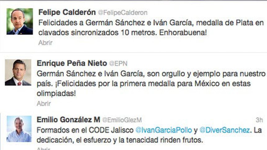 "Germán Sánchez e Iván García, son orgullo y ejemplo para nuestro país. ¡Felicidades por la primera medalla para México en estas olimpiadas!", escribió Peña Nieto en su sitio oficial de Twitter.