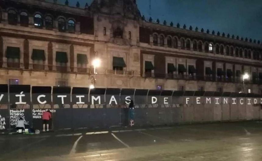 Feministas pintan vallas frente a Palacio Nacional con nombres de víctimas
