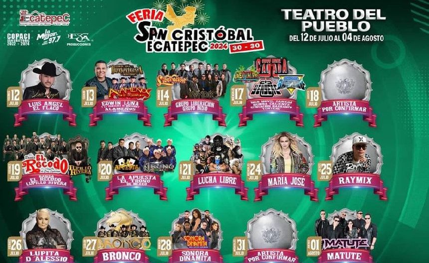 En este 2024, La Feria de San Cristóbal Ecatepec se realizará del 12 de julio hasta el 4 de agosto y contará con más de 20 grupos presentándose en vivo.