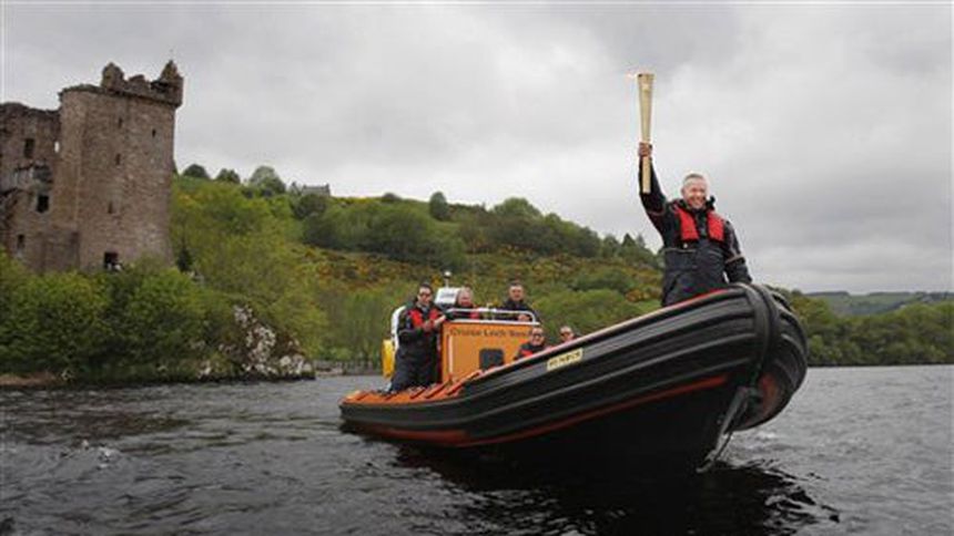 La Antorcha Olímpica cruzó el sábado el Lago Ness, hogar de una mítica criatura, como parte de su recorrido antes de la inauguración de los Juegos Olímpicos de Londres.