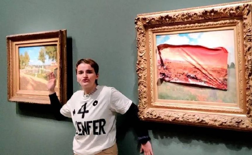 El primero de junio de 2024, la mujer pegó un cartel rojo "de unos 50 centímetros de largo" que representaba un paisaje apocalíptico, antes de pegar su mano a la pared junto al lienzo del pintor impresionista sobre una escena campestre con amapolas.