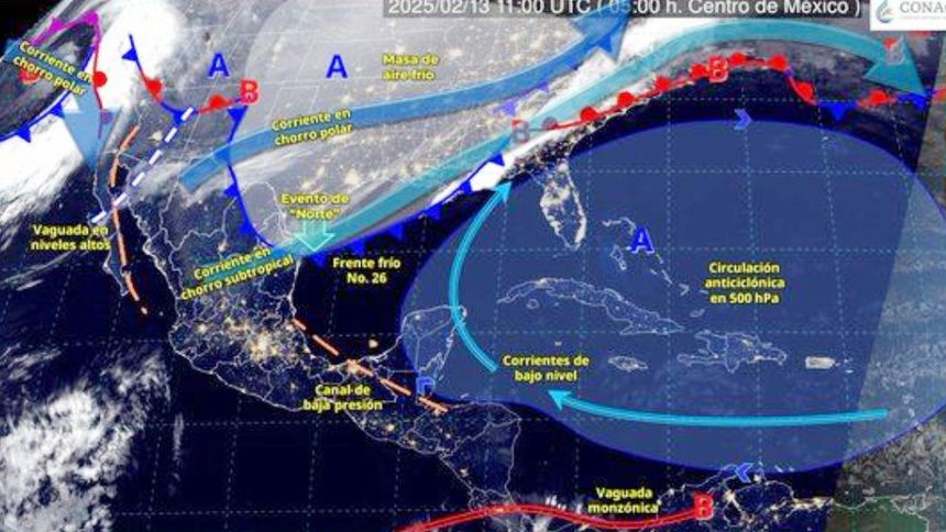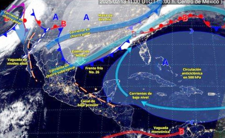 El Servicio Meteorológico Nacional (SMN) informó que para este jueves 13 de febrero el Frente Frío 26 estará provocando lluvias intensas en algunos estados.