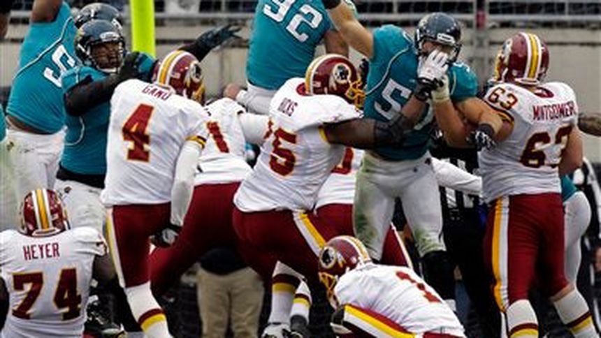 Kevin Barnes interceptó el domingo el segundo pase de David Garrard en el tiempo extra, con lo que dejó lugar a un gol de campo de 31 yardas de Graham Gano para que los Pieles Rojas de Washington vencieran 20-17 a los Jaguares de Jacksonville.