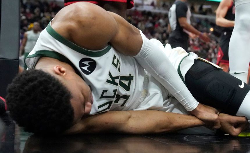 Giannis Antetokounmpo permaneció unos segundos tendido en el piso. Hizo una mueca de dolor y luego se fue. Una torcedura de muñeca en los albores del partido puso fin anticipado a su noche.