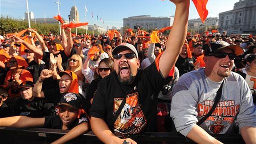Los hinchas abarrotaron las aceras e inundaron el centro cívico para homenajear a un equipo que el lunes ganó su primera Serie Mundial en San Francisco al vencer en cinco partidos a los Rangers de Texas.