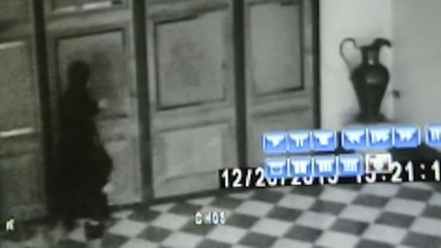 Las grabaciones de las cámaras de vigilancia muestran que el sacerdote aparece enfrente de la puerta con la mujer.