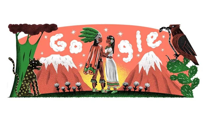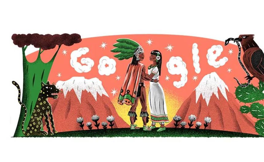 El Doodle, diseñado por Charles Glaubitz, celebra la independencia de México y rinde homenaje a una leyenda ancestral. En la ilustración destacan los volcanes Popocatépetl e Iztaccíhuatl, que en la mitología náhuatl representan a dos amantes unidos por el destino.