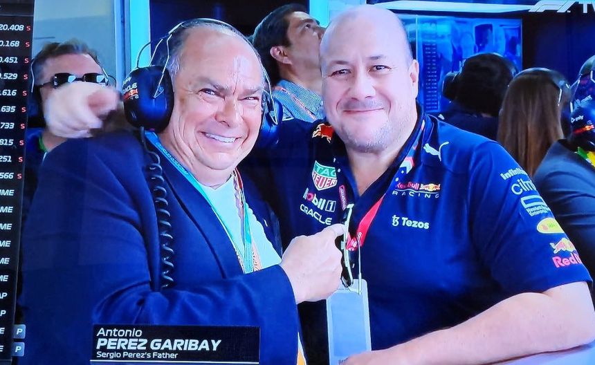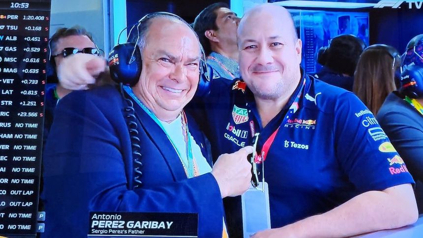 Y es que durante las Qualys del Circuito de la Ciudad de México, las cámaras internacionales de la F1 captaron a Pérez Garibay apoyando a su hijo, sonriente señaló a Alfaro, quien con cara de pánico, aunque después soltó una sonrisa, volteó a las cámaras. Eso sí, disfrutando del paddock de Red Bull.