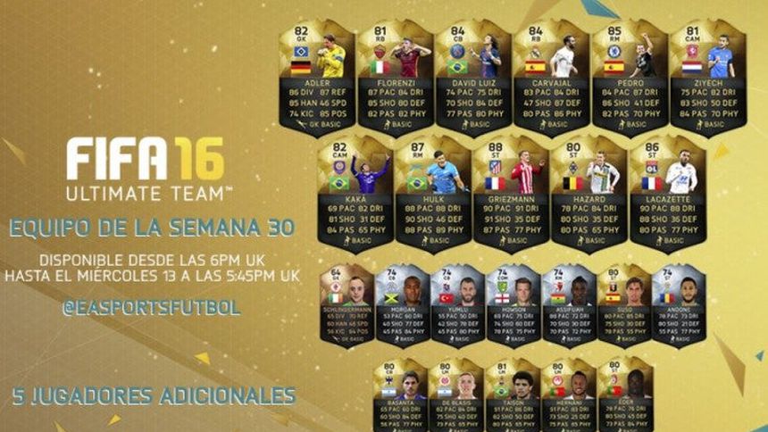 El equipo ideal del FIFA 16 en la Semana 30 está lleno de filosofía ofensiva, pues son hasta seis jugadores de condiciones goleadoras las que engalanan la oncena más destacada.