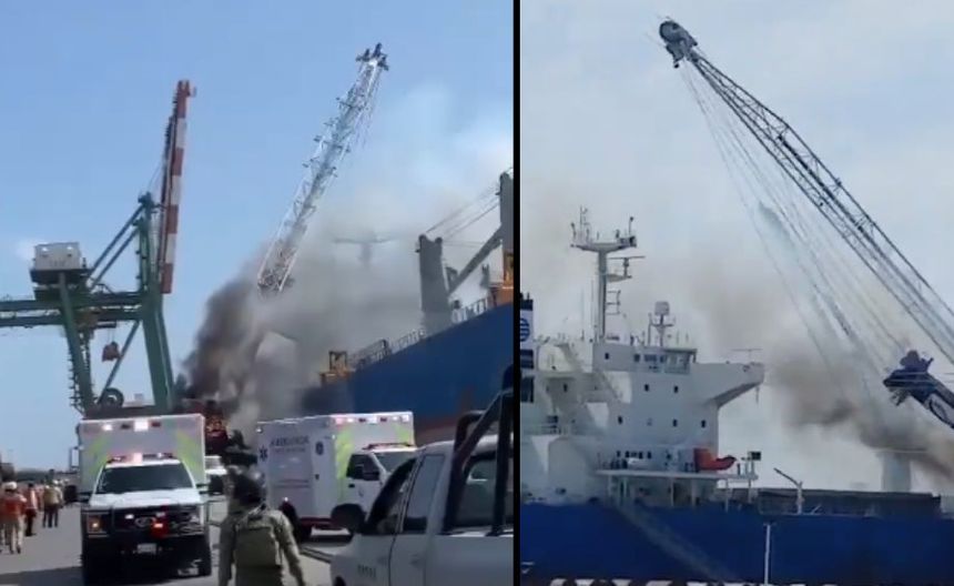 La tarde de este miércoles, se incendió una grúa en el puerto de Altamira, Tamaulipas, lo que hizo que se fuera directo sobre un buque de carga.