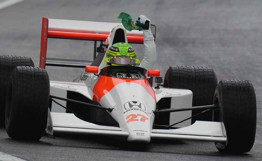 Utilizando un uniforme blanco de carreras, Hamilton realizó algunas vueltas bajo la lluvia a bordo del histórico McLaren MP4/5B que condujo Senna durante su campaña ganadora en 1990, en la cual superó a Alain Prost de Ferrari. El piloto de Mercedes fue mostrado con la bandera a cuadros por la gimnasta campeona olímpica Rebeca Andrade mientras él llevaba la bandera brasileña en su mano derecha, imitando lo que hacía el legendario tres veces campeón del mundo luego de varias de sus victorias.